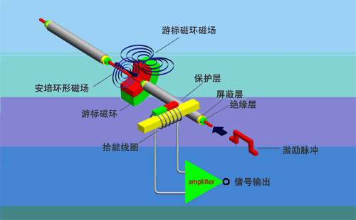 磁致伸縮傳感器的工作原理如下圖。該產品主要由測桿、電子倉和套在測桿上的非接觸的磁環組成。測桿內裝有磁致伸縮線(波導絲),測桿由不導磁的不銹鋼管制成,可靠地保護了波導絲。工作時,由電子倉內電子電路產生一起始脈沖,此起始脈沖在波導絲中傳輸時,同時產生了一沿波導絲方向前進的旋轉磁場,當這個磁場與磁環中的永久磁場相遇時,產生磁致伸縮效應,使波導絲發生扭動,這一扭動被安裝在電子倉內的拾能機構所感知并轉換成相應的返回脈沖,通過電子電路計算出起始脈沖與返回脈沖之間的時間差